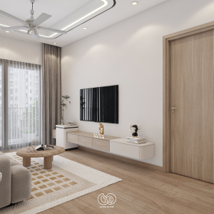 Phòng khách được thiết kế theo phong cách tối giản: Sofa sáng màu kết hợp bàn trà gỗ tròn, kệ tivi treo gọn gàng, tiết kiệm diện tích, thảm trải sàn họa tiết nhẹ nhàng