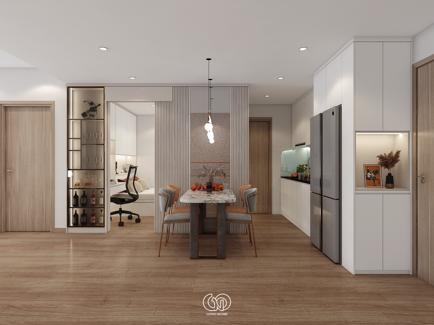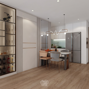 Bàn ăn được đặt ở vị trí trung tâm, nổi bật với: Mặt bàn đá vân mây sang trọng, ghế ăn phối màu tinh tế (xám – cam), đèn thả trần thiết kế uốn lượn độc đáo. Phía sau bàn ăn là vách trang trí lam sọc kết hợp kính và tủ rượu âm tường, giúp tăng chiều sâu không gian và tạo điểm nhấn cao cấp.