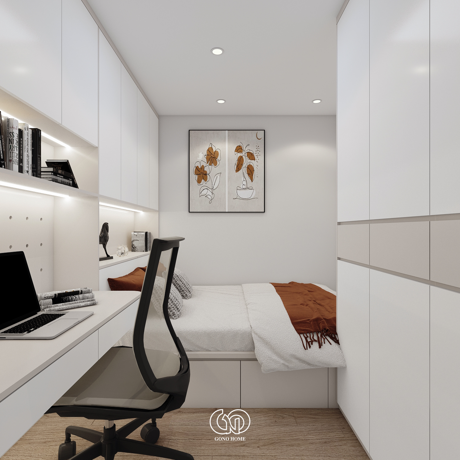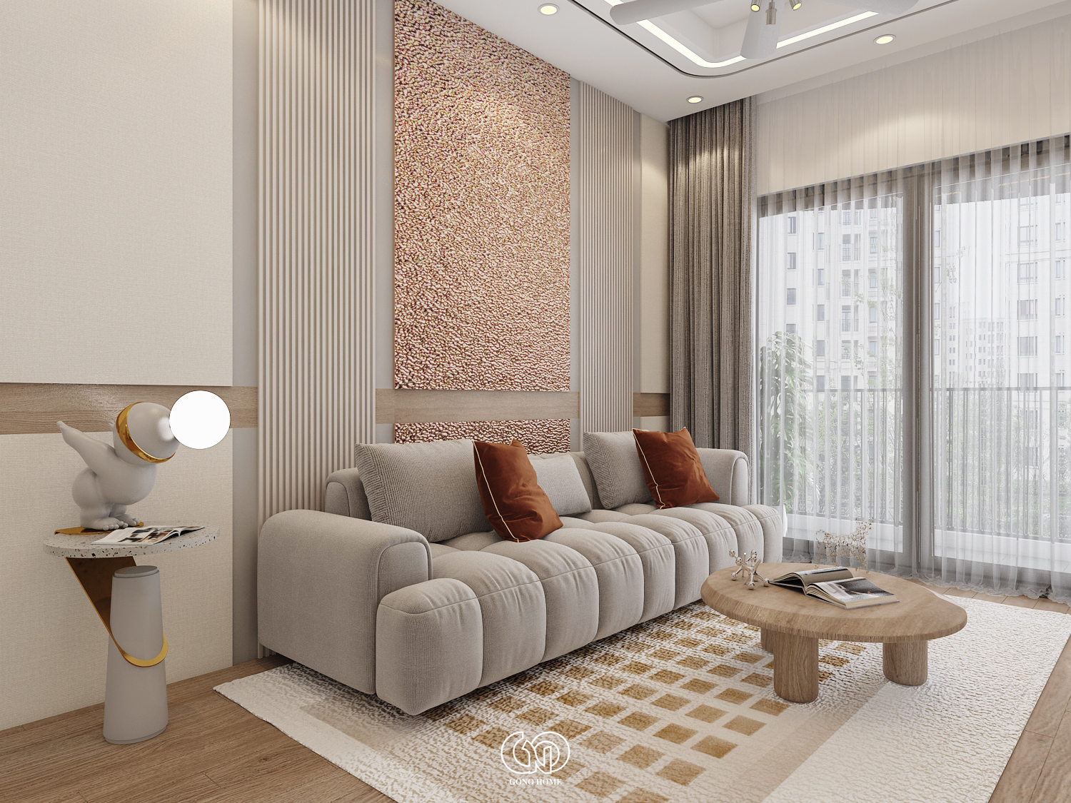Gam màu chủ đạo là trắng – be – gỗ – cam đất, mang lại cảm giác ấm cúng, gần gũi nhưng không kém phần sang trọng.