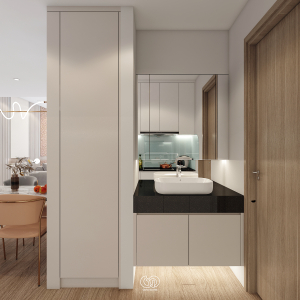 Không gian bếp được thiết kế liền kề: Tủ bếp trên dưới tối giản, gam màu trắng giúp mở rộng không gian, bố trí khoa học, thuận tiện di chuyển. Đây là giải pháp tối ưu cho căn hộ có diện tích vừa và nhỏ.