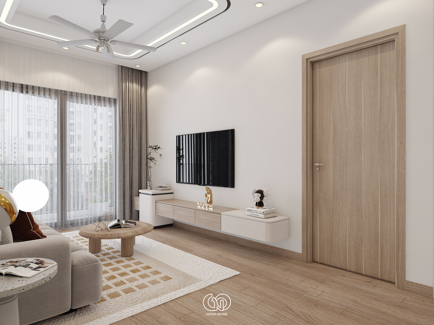 Phòng khách được thiết kế theo phong cách tối giản: Sofa sáng màu kết hợp bàn trà gỗ tròn, kệ tivi treo gọn gàng, tiết kiệm diện tích, thảm trải sàn họa tiết nhẹ nhàng
